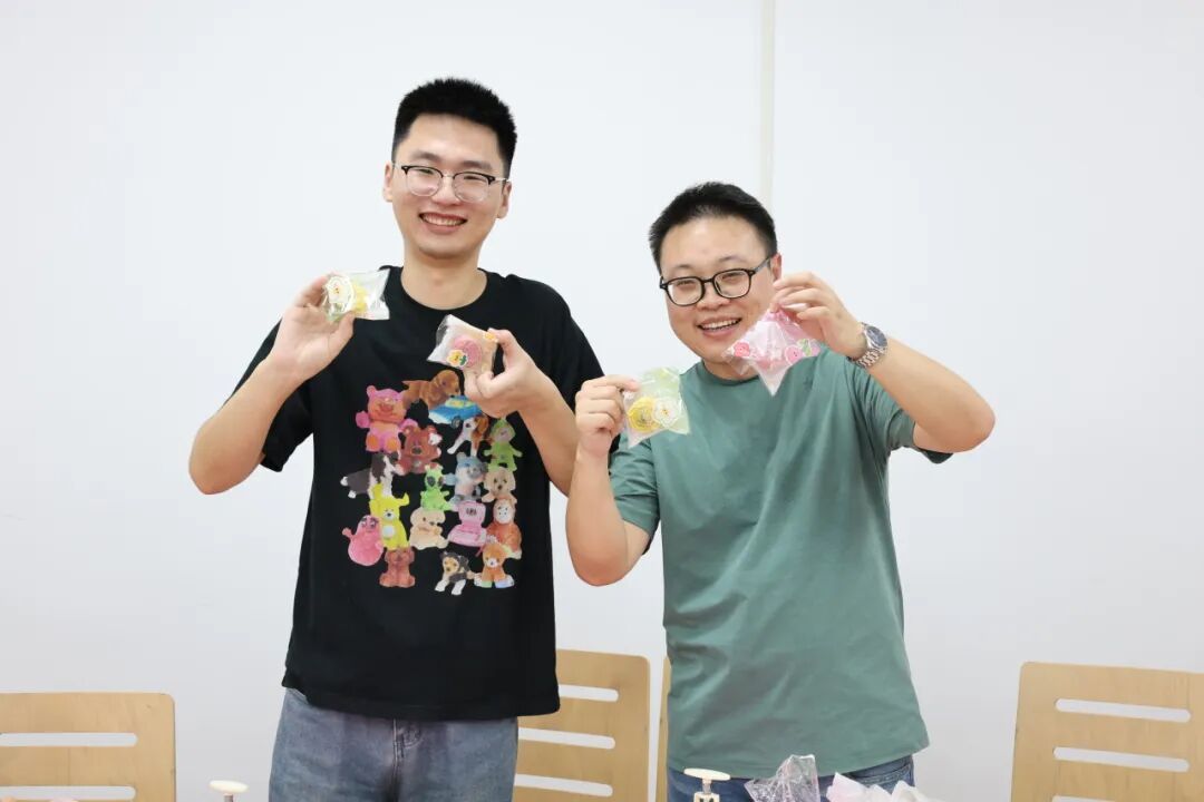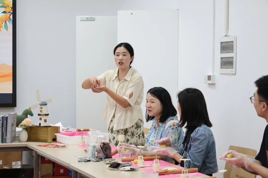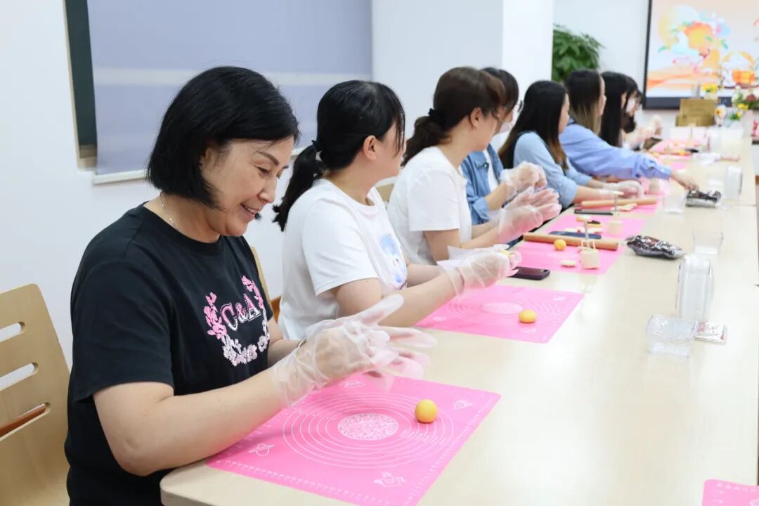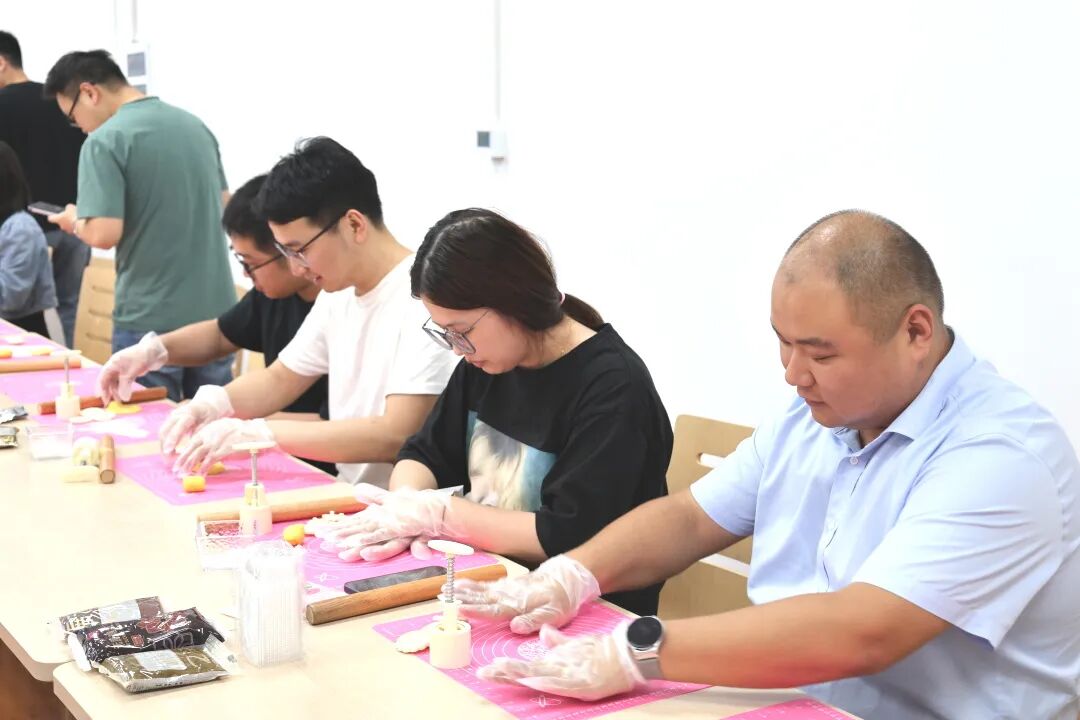 1902会议室的“糕点工坊”氤氲着麦香,制作月饼的工具、模具整齐摆放。随着老师讲解,数十名员工分成数组,有人双手揉搓面团,有人手持模具按压成型,有人将包好的月饼码放进小盒中。员工自发组成“互助小组”,有的手把手教同事捏出精致的花纹,有的则细心调试馅料比例,将童年记忆中的豆沙香味融入现代配方。看着自己亲手做的月饼,员工们脸上都乐开了花。这次活动不仅让大家提前尝到了中秋的甜蜜,更拉近了同事间的距离。