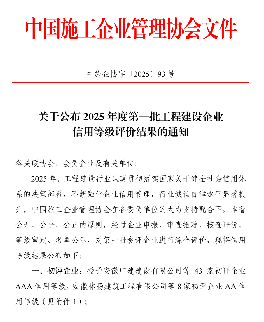 10月17日,中国施工企业管理协会(以下简称“中施企协”)正式发布《关于公布2025年度第一批工程建设企业信用等级评价结果的通知》,湖北市政建设集团有限公司(以下简称“湖北市政集团”)及旗下基础设施公司均荣获工程建设企业信用等级评价的最高等级——AAA级!