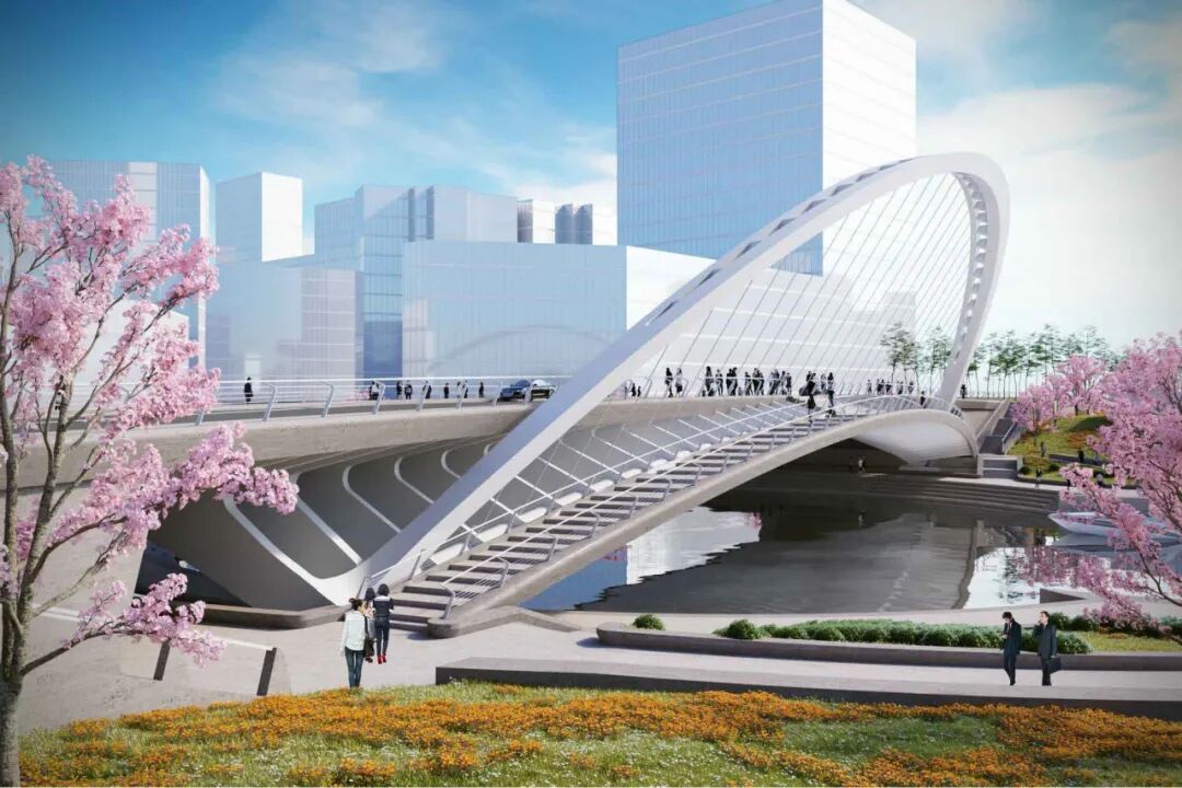 作为跨越花山河的三座景观桥之一,希琥桥在设计与建设中深度践行公司“精细管理、精益建设”理念,兼具功能性与观赏性。桥梁全长123米、宽22.6米,采用双向4车道设计,创新性应用拱跨82米的新型密肋式横梁-上下拱组合承重结构。全桥共设P1、P4两个对称钢墩,采用Q500qD-Z35、Q500qD等高强度钢材制造,最大板厚达80毫米。