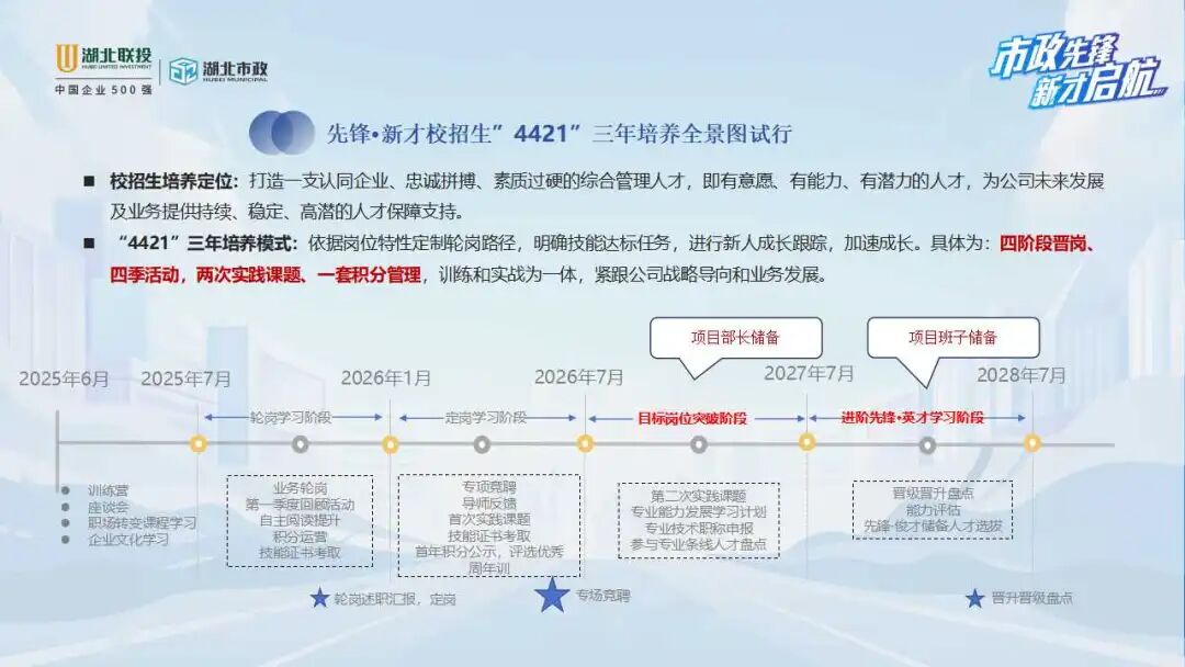 “刚从校园出来时,满脑子都是书本上的理论和公式,可一到机器轰鸣、千头万绪的施工现场,我才发现自己几乎‘两眼一抹黑’,对实际工作完全不知从何下手,”湖北市政集团2025届校招员工郭正骁在“新才启航,闪亮90天”分享会上感慨道,“多亏了公司‘先锋·新才’集训和第一阶段90天的系统轮岗计划,让我快速找准定位,在实践中学习、在导师指导下快速成长,如今已能在现场施工管理、技术材料整理上游刃有余。公司为我们量身打造的‘4421’培养计划,不仅让我少走了很多弯路,更让我对未来三年有了清晰的成长路径和发展目标,每一步都走得踏实、有方向。”