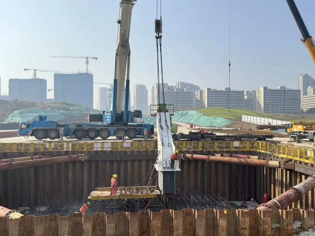 近日,希琥路跨花山河桥梁顺利完成首件钢墩吊装,正全力推进下部结构承台施工,3000吨钢板同步启动大批量下料;羡璧路跨花山河桥梁完成承台钢板桩支护、基坑开挖及拱脚吊装,现阶段聚焦承台主体施工。