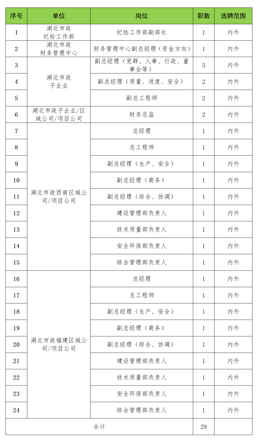 结合经营发展需要,本次市场化选聘24个岗位29个职数,所有岗位在湖北联投集团内外同步展开,符合条件的人员均可报名参与,具体详见下表:
