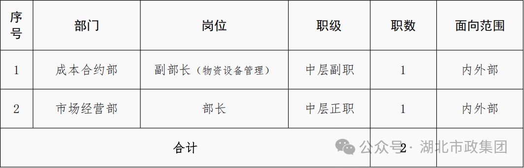 本次市场化选聘共2个职数,面向湖北联投内、外部同时进行。符合条件的人员均可报名参加。