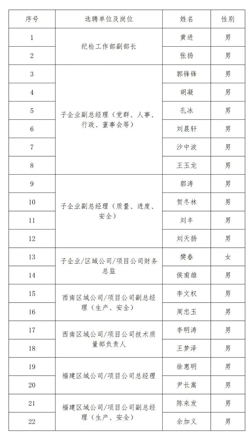 以上人员将进入考察阶段,财务管理中心副总经理、子企业副总工程师、福建区域公司/项目公司建设管理部负责人、福建区域公司/项目公司综合管理部负责人4个岗位因无匹配人选拟取消。部分考察对象的拟录用岗位需要调剂,具体由领导小组讨论研究,特此公示。